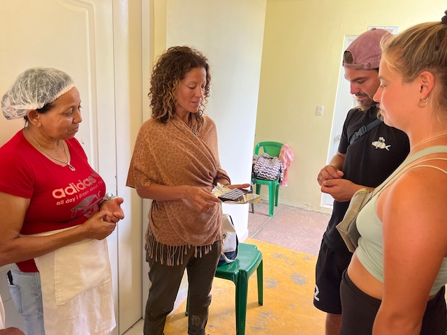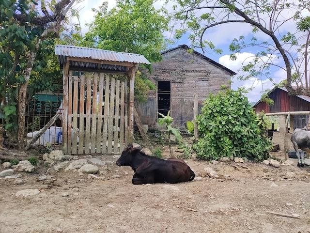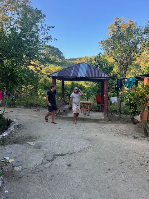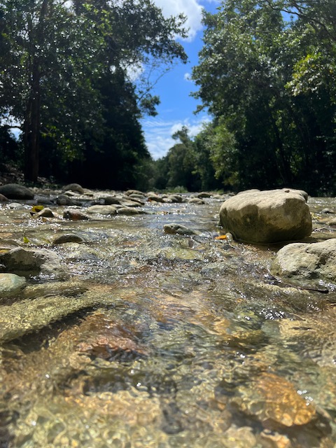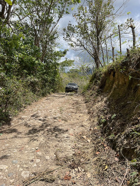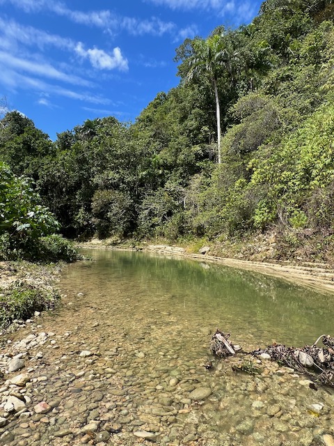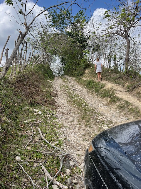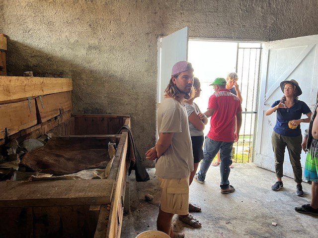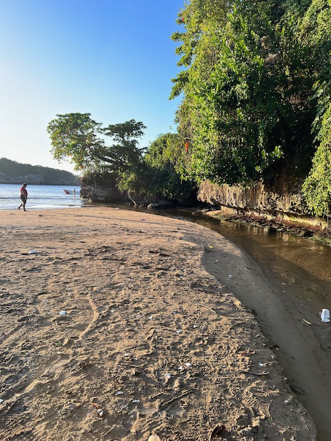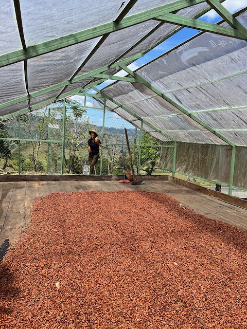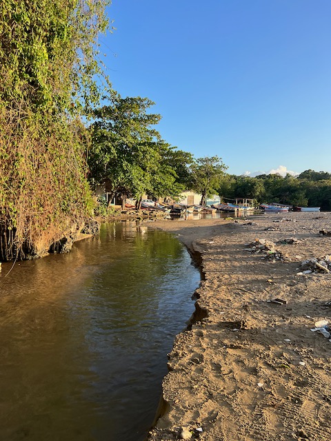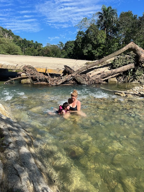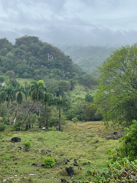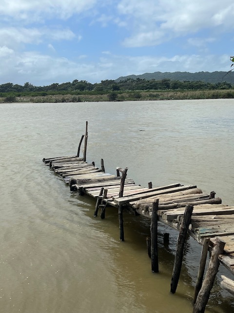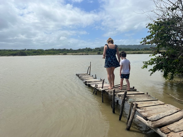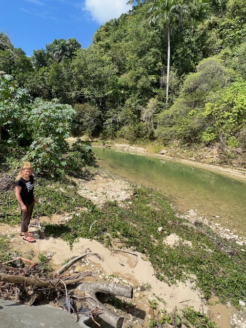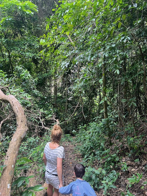 Wir erfahren die idyllischen, malerischen Seiten, erwandern, sobald unser Auto nicht mehr weiter kommt, die Berge. Babyhunde, Transportesel, kleine Bauernhöfe mit spielenden Kindern und frei laufendem Vieh begeistern uns genauso wie die unbeschreiblichen Aussichten auf üppig grünen Jungle und tiefe Täler. Einmal bestehen zwei junge Männer darauf uns zu führen, das Wanderbuch wäre nicht zuverlässig. Und wirklich, nach 1,5 Stunden über Wiesen und Weiden, durch Dickicht, Dornen und Wälder, gelangen wir an einen großen Wasserfall. Totale Einsamkeit. Während wir baden, essen die beiden unserer gesamten Reiseproviant auf. Hatte ich ihnen angeboten. Am Ende des langen Aufstiegs, den Gydes 5 jähriger, wie die meisten Wege, super bewältigt hatte, werden wir von der restlichen Familie begleitet. Lautes Geschnatter und große Freude, als Bosse dem kleinsten Kind seine neuen Schuhe schenkt. Eine weitere Wanderung führt uns tief in die Kakaoplantagen. Google Earth zeigt einen mäandernden Fluß, mit größeren Wasserflächen, der Badespaß verheißt. Nach einer Stunde erreichen wir diesen magischen Ort. Mächtige, Lianenbehangende Urwaldriesen überspannen den Fluss, seichte Bereiche mit kristallklarem Wasser über runden Kieseln und glitzernden Halbedelsteinen wechseln sich mit tiefschwarzen unergründlichen Becken. Lauern dort wohl gruselige Kreaturen auf uns? Nach mutigem Bad wärmt der Fels an den wenigen Stellen, die von der Sonne erreicht werden. Das Picknick, natürlich vom Buffet geraubt, schmeckt köstlich, der passende Wein ist allerdings nur Wasser. Kurz bevor wir den Rückweg antreten, kommt eine Frau aus den angrenzenden Hügeln zum Fluss. Die Bewohner des nahen Dorfes hätten ihr erzählt, das drei Gringos am Fluss wären und da das eigentlich nie passiert, wollte sie doch mal schauen was da los ist. Sie heißt Joanna, hat in New York und Europa gelebt, Chocolateir gelernt und ist kürzlich in die Dominikanische Republik zurückgekehrt um die Kakaowälder der Familie weiter zu führen und die Magie dieser Frucht zu leben und zu kultivieren. Sie unterstützt und stärkt die nur von Frauen betriebene Kakaocooperative samt „Fabrik“ und Direktvertrieb. Außerdem hat sie zwei Hütten/Häuser beim Fluss gepachtet und ist dabei sie zu sanieren, auch um dort Kakaozeremonien durchzuführen. Für unsere kleine Reisegruppe ist das leider noch nichts aber Kontakte werden getauscht, mal sehen.