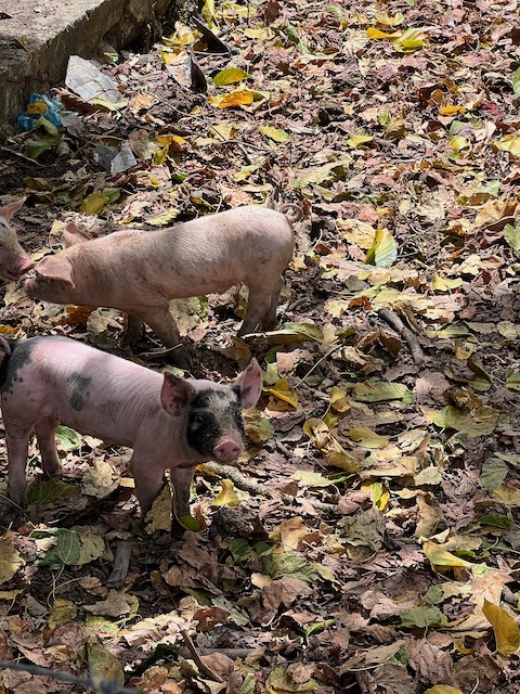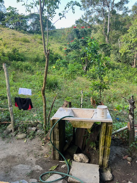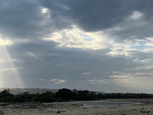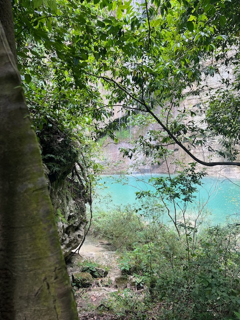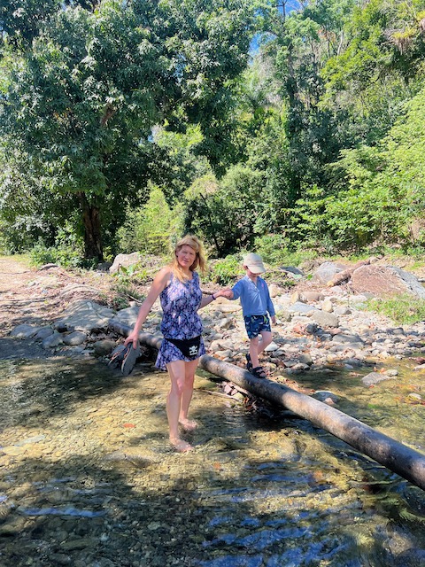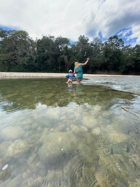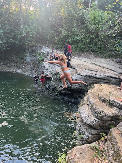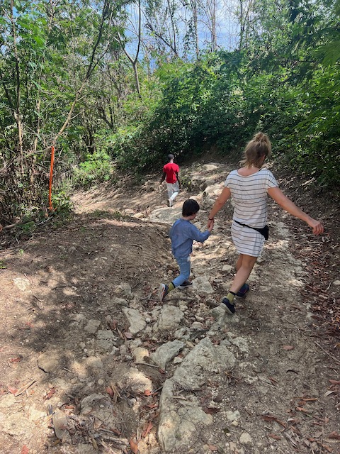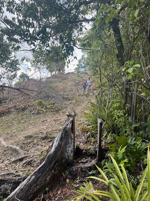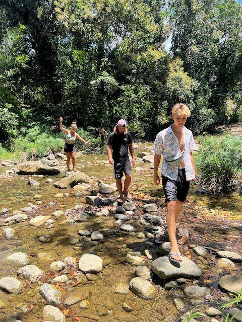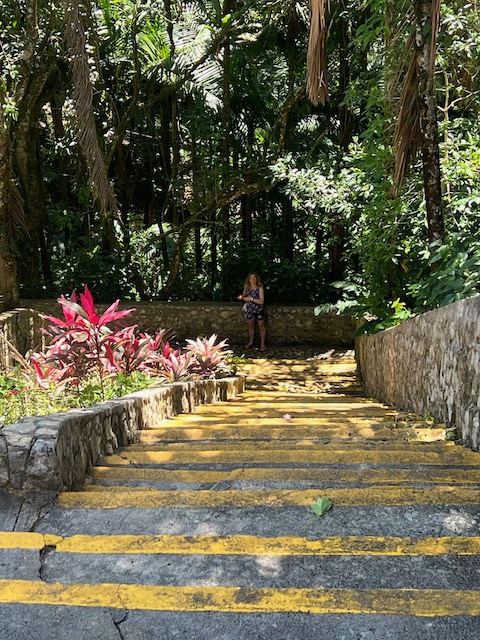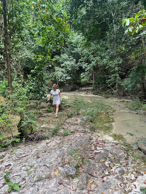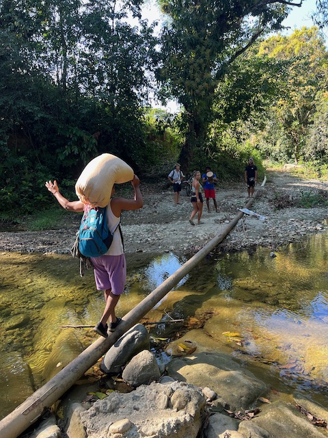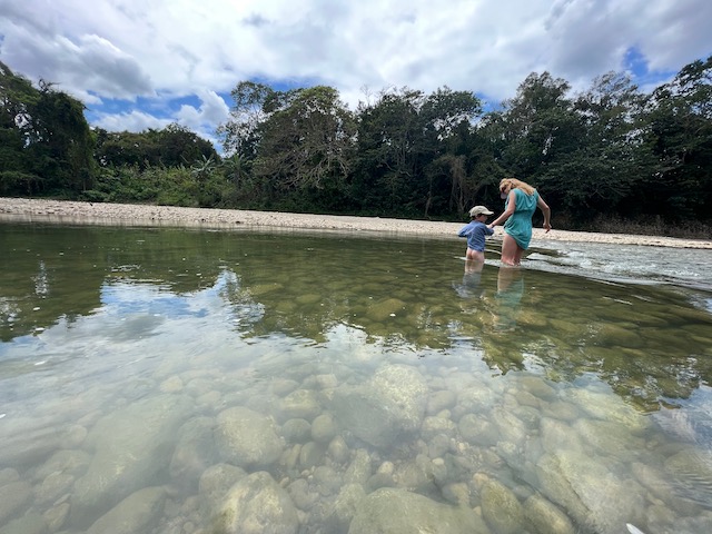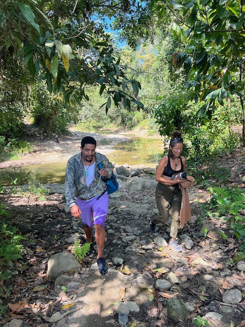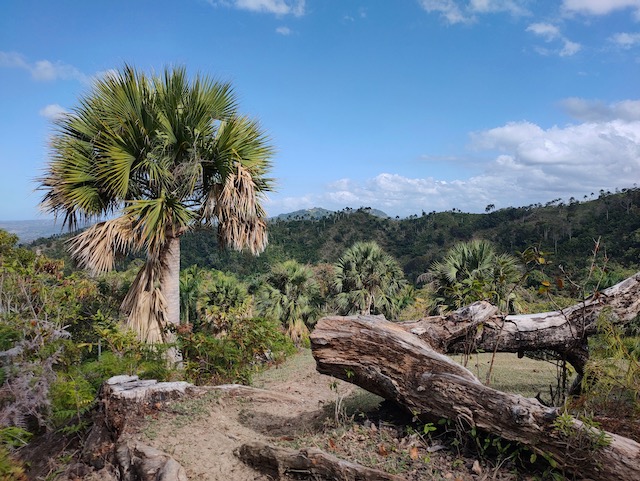 Wir erfahren die idyllischen, malerischen Seiten, erwandern, sobald unser Auto nicht mehr weiter kommt, die Berge. Babyhunde, Transportesel, kleine Bauernhöfe mit spielenden Kindern und frei laufendem Vieh begeistern uns genauso wie die unbeschreiblichen Aussichten auf üppig grünen Jungle und tiefe Täler. Einmal bestehen zwei junge Männer darauf uns zu führen, das Wanderbuch wäre nicht zuverlässig. Und wirklich, nach 1,5 Stunden über Wiesen und Weiden, durch Dickicht, Dornen und Wälder, gelangen wir an einen großen Wasserfall. Totale Einsamkeit. Während wir baden, essen die beiden unserer gesamten Reiseproviant auf. Hatte ich ihnen angeboten. Am Ende des langen Aufstiegs, den Gydes 5 jähriger, wie die meisten Wege, super bewältigt hatte, werden wir von der restlichen Familie begleitet. Lautes Geschnatter und große Freude, als Bosse dem kleinsten Kind seine neuen Schuhe schenkt. Eine weitere Wanderung führt uns tief in die Kakaoplantagen. Google Earth zeigt einen mäandernden Fluß, mit größeren Wasserflächen, der Badespaß verheißt. Nach einer Stunde erreichen wir diesen magischen Ort. Mächtige, Lianenbehangende Urwaldriesen überspannen den Fluss, seichte Bereiche mit kristallklarem Wasser über runden Kieseln und glitzernden Halbedelsteinen wechseln sich mit tiefschwarzen unergründlichen Becken. Lauern dort wohl gruselige Kreaturen auf uns? Nach mutigem Bad wärmt der Fels an den wenigen Stellen, die von der Sonne erreicht werden. Das Picknick, natürlich vom Buffet geraubt, schmeckt köstlich, der passende Wein ist allerdings nur Wasser. Kurz bevor wir den Rückweg antreten, kommt eine Frau aus den angrenzenden Hügeln zum Fluss. Die Bewohner des nahen Dorfes hätten ihr erzählt, das drei Gringos am Fluss wären und da das eigentlich nie passiert, wollte sie doch mal schauen was da los ist. Sie heißt Joanna, hat in New York und Europa gelebt, Chocolateir gelernt und ist kürzlich in die Dominikanische Republik zurückgekehrt um die Kakaowälder der Familie weiter zu führen und die Magie dieser Frucht zu leben und zu kultivieren. Sie unterstützt und stärkt die nur von Frauen betriebene Kakaocooperative samt „Fabrik“ und Direktvertrieb. Außerdem hat sie zwei Hütten/Häuser beim Fluss gepachtet und ist dabei sie zu sanieren, auch um dort Kakaozeremonien durchzuführen. Für unsere kleine Reisegruppe ist das leider noch nichts aber Kontakte werden getauscht, mal sehen.