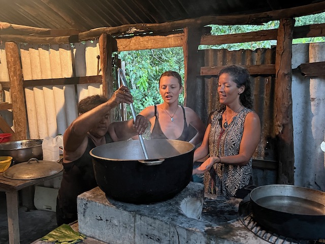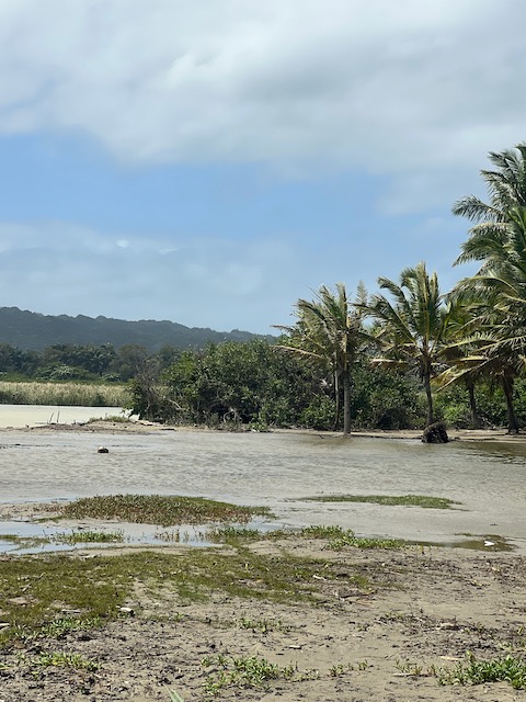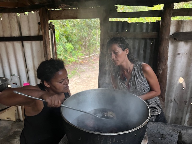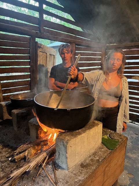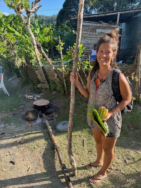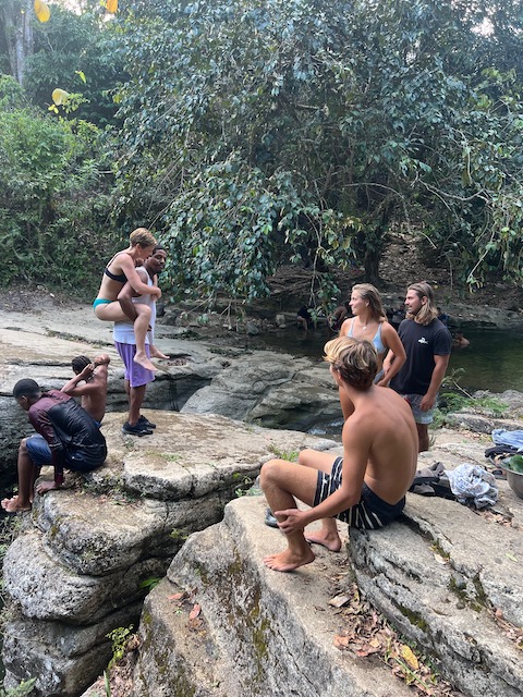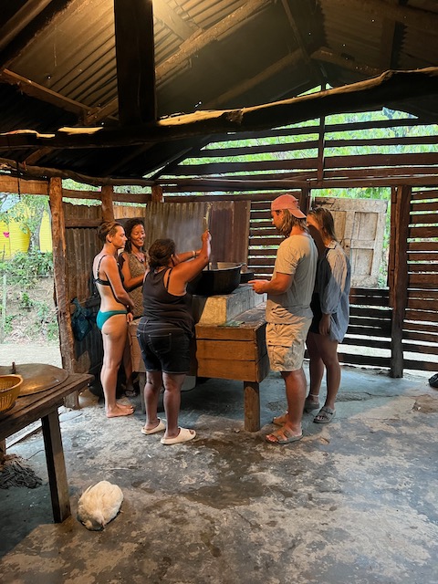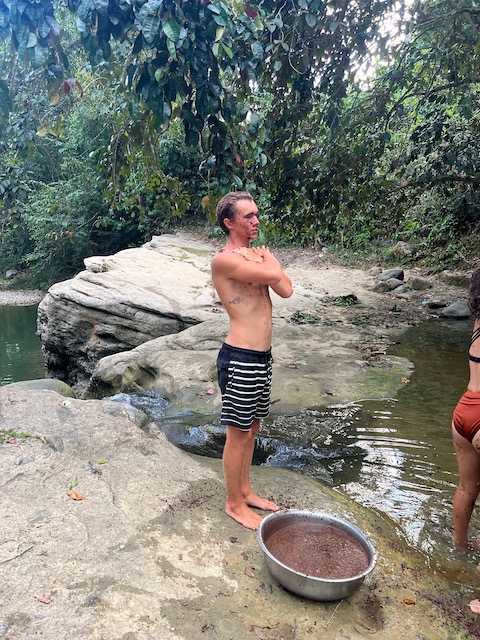 Den abschließenden Großeinkauf vorm Auslaufen gen Bahamas können wir auch in Puerto Plata machen. Vorher aber haben wir, nachdem die Berliner abgeflogen sind, noch 3 Tage zu gestalten bevor Paula kommt. Oles Vorschlag, eine Expedition in den Kakao-Jungle zu unternehmen, trifft nicht auf genug Gegenwehr und so machen wir uns im Mietwagen auf den Weg. Treffpunkt ist in Cabarete in einem Straßenrestaurant zum Frühstück. Kakao- Schamanin Joanna, ihr Freund Fernando und ihre Freundin/Kollegin Michelle haben sich am Abend vorher gestritten und über den Rum wieder zusammen gefunden. Jetzt sind sie zwar harmonisch aber völlig verklatscht und verpeilt. Als wir nach vergessenen Handys und zu tauschenden Autos in die Berge kommen, ist es bereits so spät, dass an den geplanten Ernteeinsatz in den Kakaowäldern nicht mehr zu denken ist. Die Mittagshitze. Deswegen besichtigen wir erstmal die „Fabrik“ und verbringen den Restmittag, nach schmackhaftem Mahl (Huhn mit Reis), am Fluss. Dort kann man sich auch von der langen Wanderung in den Jungle erholen. Außer uns erholen sich dort allerdings auch die Bewohner von mindestens zwei Dörfern und die magische, spirituell aufgeladene Atmosphäre ist vorübergehend der eines Freibads gewichen. Das Klippenspringen und schwimmen hat trotzdem viel Spaß gemacht. Und außerdem, wenn man einen Plan hat, kann einen nichts aufhalten. Und den hat Joanna: wir sollen mit ihr, Michelle und dem angereisten Schamanen, Denker und Geschichtenerzähler Marcello die erste Kakaozeremonie an diesem Ort feiern. Oh Schreck und welche Ehre. Doch, wir beschließen, uns darauf einzulassen, sind sehr gespannt ob sich unser gesamtes Leben ändern wird. Am späten Nachmittag, inzwischen ist magische Ruhe am Fluß eingekehrt, beginnt alles mit der rituellen Waschung. Ein Sud aus Wasser und den Schalen der Kakaofrüchte, unter Gesang auf den ganzen Körper geschmiert, befreit uns von schlechten Energien, der fließende Fluss dann von den Schalen. Während Marcello und Michelle einen Energiekreis am Fluss einrichten wird Kakao gekocht, auf dem offenen Feuer der traditionellen Küche rühren die Frauen nach geheimem Rezept den Trank. Immer im Uhrzeigersinn unter Gesang und mächtig viel Qualm. Männer dürfen nicht mitmachen.
