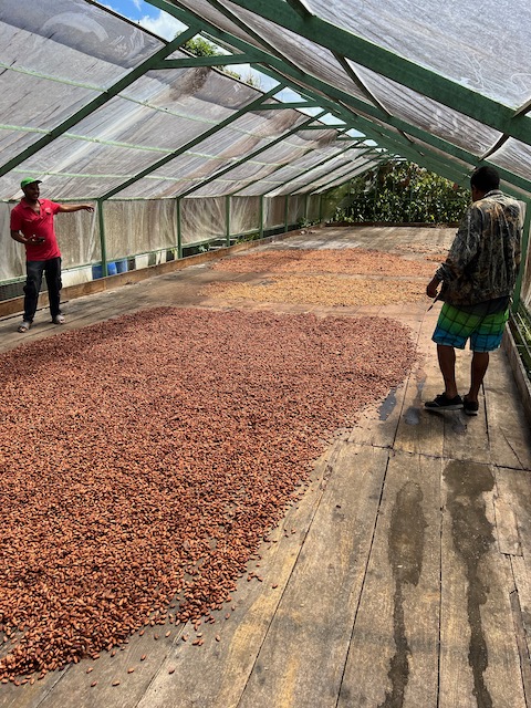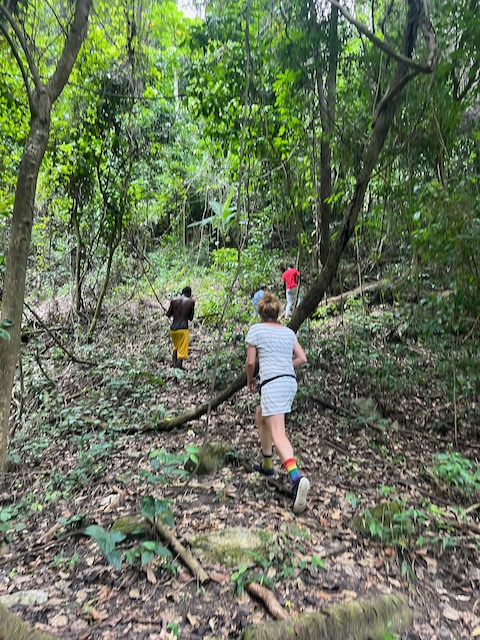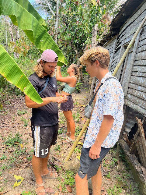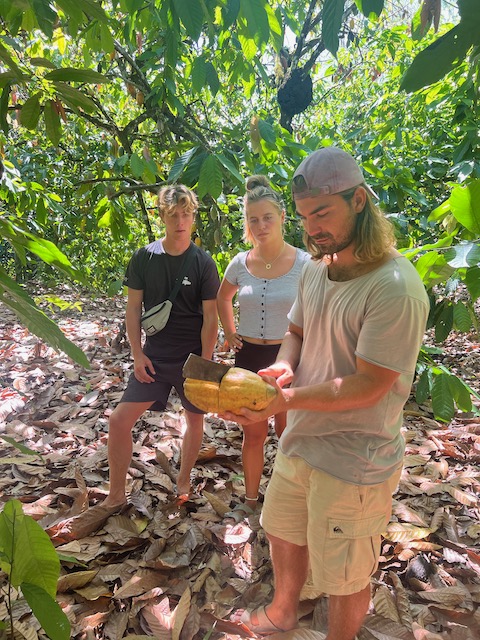 Früh morgens ein Bad im Fluss und dann mit Verspätung, die Kakao Gang hat verschlafen, in die Kakaowälder. Wieder nicht ganz gelungen, Joanna findet den Weg nicht und Michelle und Marcello verlaufen sich komplett. Also darf Jesper früher als geplant mit der Machete etwas Erntearbeit ausführen und wir haben Muße uns zu unterhalten. Aus diesem Dorf ging Joanna, aufgewachsen bei der Großmutter, fort um dem Machoverhalten der Männer zu entkommen, jetzt ist sie wieder da und versucht Bewegung in die Gesellschaft zu bekommen. Dafür wird sie geliebt und gehasst, unterstützt und blockiert. Die Bretter, die sie bohren muss sind sehr dick. Zum Glück gibt es auch viele Unterstützer, einige davon laden uns zu sich zum Essen ein (Huhn mit Reis). Danach heißt es Abschied nehmen, es war schon ein bisschen irre aber auch sehr spannend. Ob sich diese Zeremonien zum Geschäftsmodel eignen bezweifeln wir allerdings.