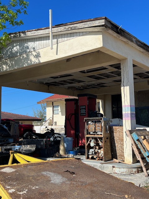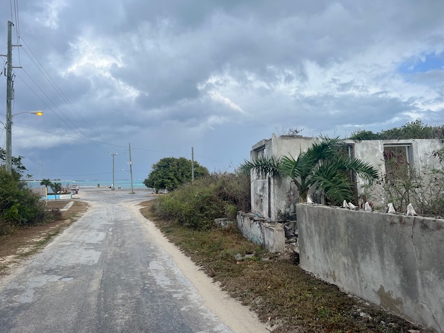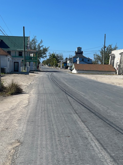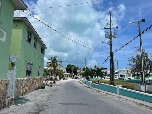 Aber immerhin weniger weit zum Hogsty Reef Atoll, dem ersten Ziel des nächsten Tages. Dieses Naturschutzparadies liegt mehr als 30 Meilen von jedem Land entfernt, besteht aus einem ca. 200 x 50 Meter großen Sandhaufen und einem kreisrunden Riff, von ca. 4 Meilen Durchmesser. Nur bei absolut stillem Wetter zu besuchen. Daran mangelt es nicht, seit Tagen, und für mehrere weitere Tage gibt es keinen Wind. Also Anker neben den Sandhaufen geworfen und ab zum schnorcheln. Der erste Teil ist enttäuschend, sparsame Korallen und wenige Fische, dann jedoch treffen wir mehrere Haie, teils recht groß und nicht sehr scheu, sehr beeindruckend. Nach erwandern des Sandhaufens auf dem ein malerisches Wrack thront, beschließen wir, von dem weiten Weg die Bahamas hinauf etwas abzuziehen und noch eine Nacht weiter zu fahren. Natürlich ohne Wind. Der ewige Motorenlärm geht uns nicht nur auf die Nerven sondern reduziert auch den Inhalt der Treibstofftanks. So laufen wir, nach ereignisloser Fahrt durch die wolkenverhangene Dunkelheit, in Clearance Town ein. Die angefunkte Marina behauptet keinen Platz zu haben, beim Besuch ihrer Dieselpier sehen wir jedoch ungefähr 12 freie Plätze. Der unförmige, grummelige Marinamanager bestätigt, alles sei reserviert und würde sich bald füllen. Was ist los mit den Leuten? Gewöhnlich wollen alle unser Geld. Da wir noch nicht einmal zum einkaufen bleiben dürfen gehen wir leicht angefressen an den Anker. Das Wetter verschlechtert sich, ein Schauer jagt den nächsten, in der Bucht kommen kleine Hackwellen auf. Die stören Aurora nicht, machen aber den Dinghiritt zur öffentlichen Pier sehr ungemütlich und nass. Deshalb fährt Ole allein, um die Einkaufsmöglichkeiten zu erkunden. In diesem Kaff möchte man wirklich nicht tot überm Zaun hängen. Die Gebäude sind nicht nur weit voneinander entfernt und in der Ursprungsform langweilig und trist, sondern auch ungepflegt, verkommen oder verlassen. Als Attraktion wird neben der Polizeistation der Government Complex beworben. Der Laden/Bäcker hat heute geschlossen.