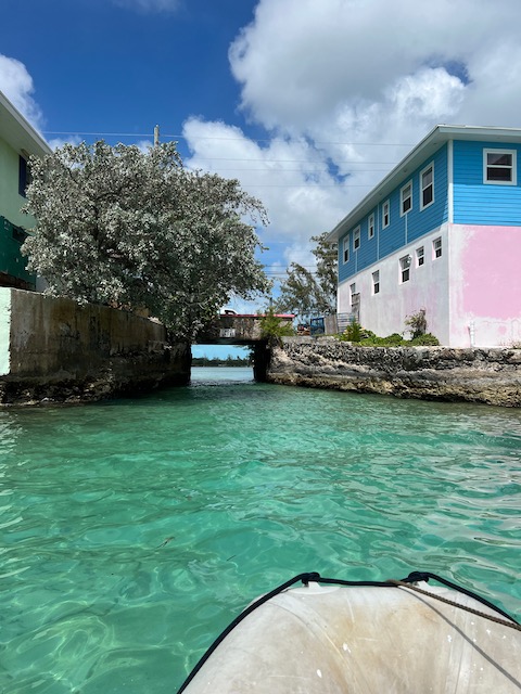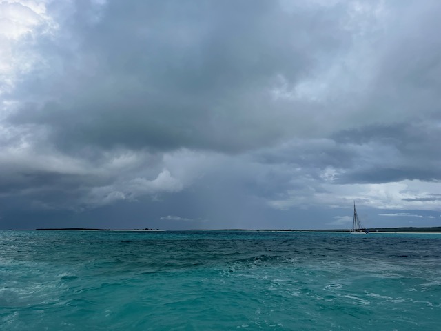 Noch ein Stop, noch eine Chance für die Bahamas. Anker auf, alle Segel hoch und in den Abend, die Nacht. Die anfängliche Freude über strahlende Sterne wird bald von großen schwarzen Wolken getrübt. Von 21 bis 23:00 Uhr blitzt es ununterbrochen in Luv, dann kommt plötzlich Bewegung in den Himmel, wir bergen gerade noch rechtzeitig die Segel bevor es richtig los geht. Harte Gewitterböen schütteln das Schiff, dann regnet es für über eine Stunde so stark, dass vom Steuerrad das Vorschiff nicht mehr zu sehen ist. Da hilft nur die Pferdestrategie: Arsch in den Wind und Kopf hängen lassen. Mit zunehmender Wetterberuhigung setzen wir nach und nach mehr Segel und erleben doch noch eine schöne Nachtsegelei bevor wir in strahlendem Sonnenschein hinter die Riffs vor George Town, Great Exuma einlaufen. Wir ankern stadtnah auf 2,2 Meter Wasser. Hier ist es schon wesentlich schöner, fröhlich angemalte Häuser, Bars und Restaurants, ein großer Supermarkt voller günstiger Angebote. Z.B. ein Kilo Kartoffeln für 12 Dollar…. einkaufen und nicht auf den Bon gucken.