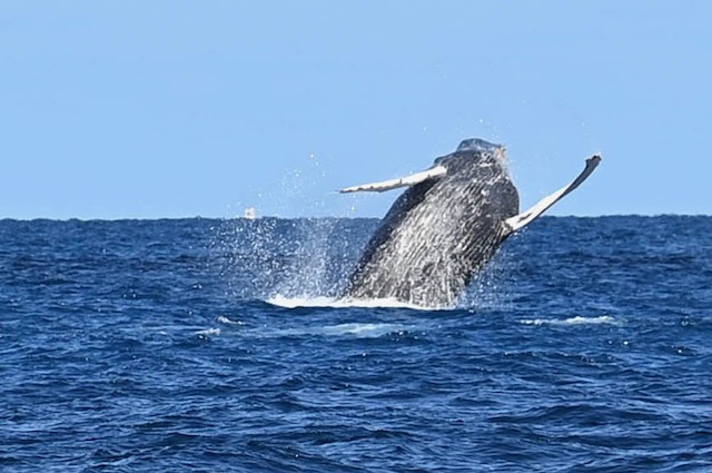 Etwas belastend wird es, als fast schon in Sichtweite der Insel der Wind beinahe ganz einschläft, die Wellen aber natürlich bleiben und zum direkten Motoren der Treibstoff nicht reichen würde. Also noch ein paar Stunden Schleichfahrt hoch am Wind bis in den Wellenschatten der 20 Seemeilen vorgelagerten Riffe, jetzt geht es voran, der Diesel darf auch brummen. Zur Begrüßung, während wir an grünem Land entlang schippern, kommt ein Buckelwal Weibchen mit ihrem Baby und zieht für uns eine Sprungshow ab.
