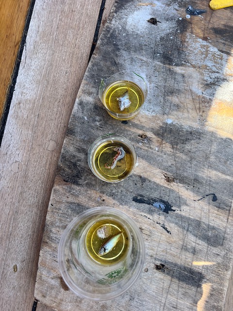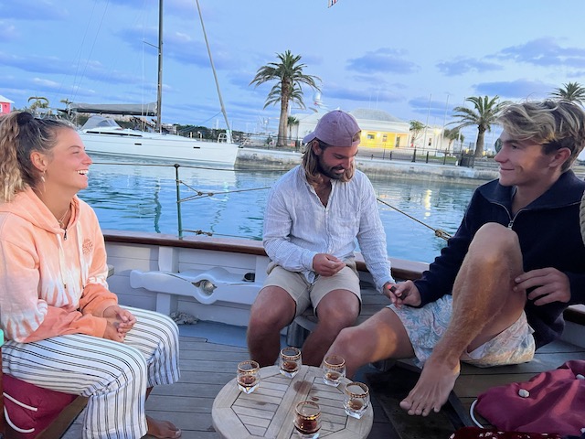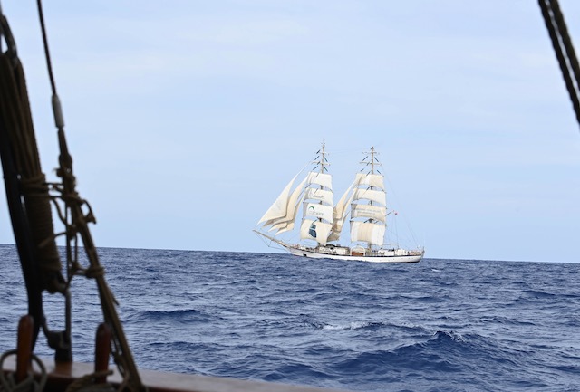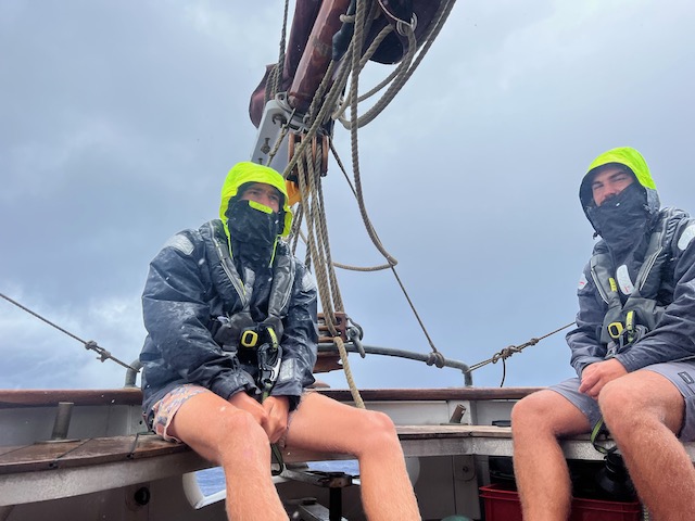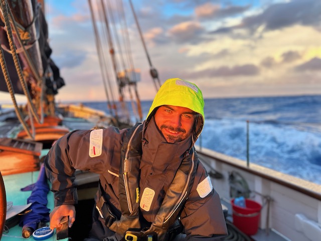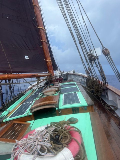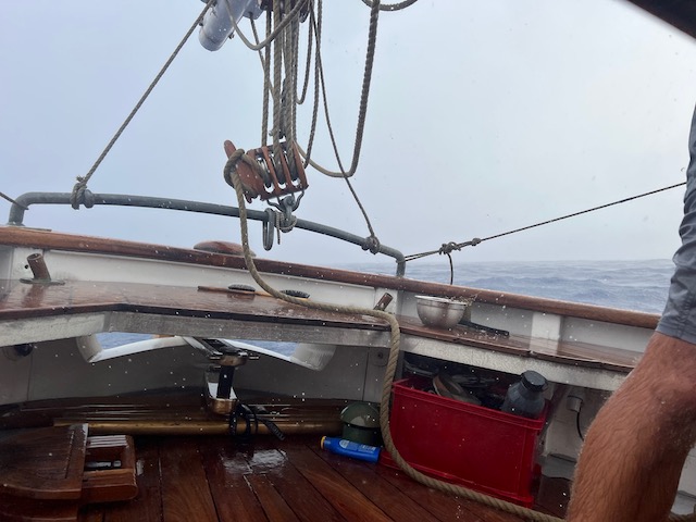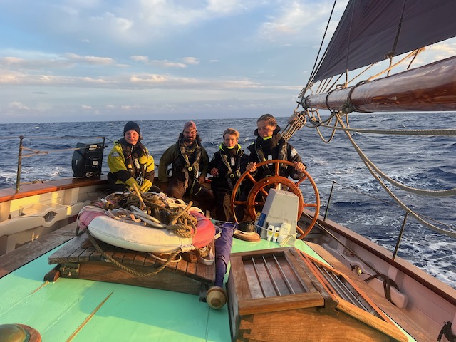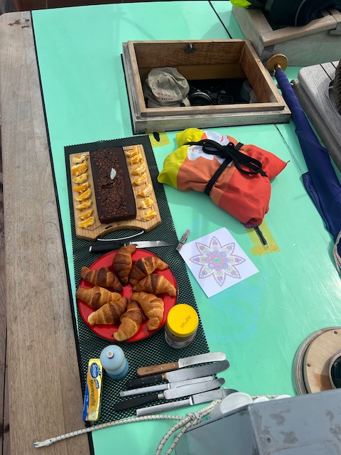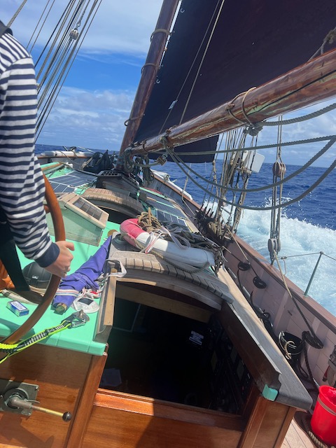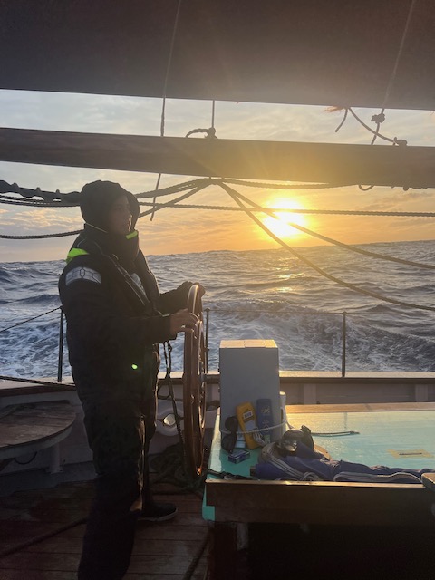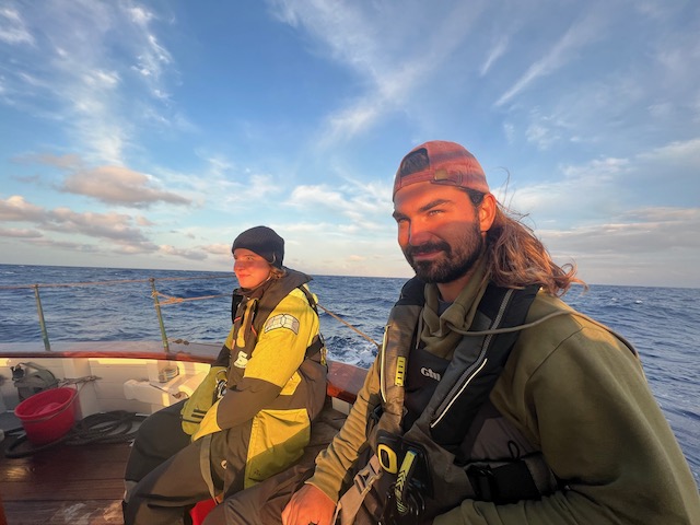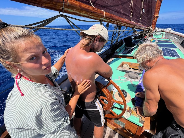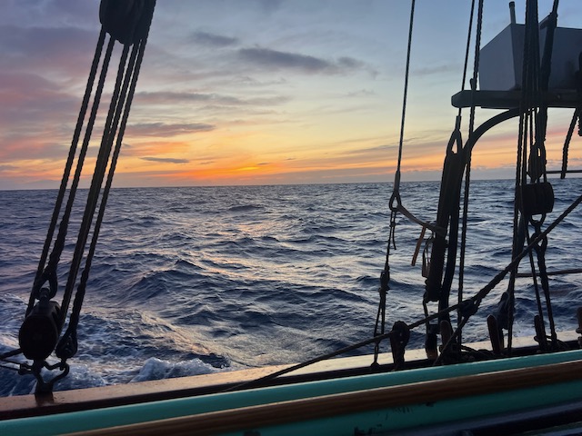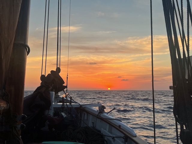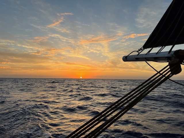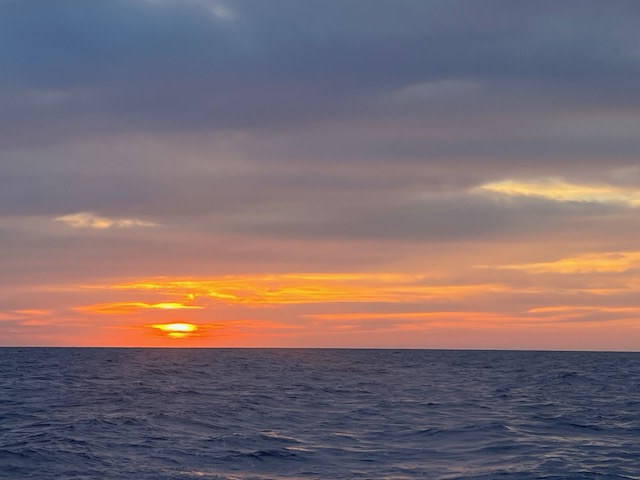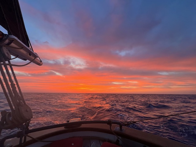 So geht es mehrere Tage, Winde von überall, mal wenig, mal erheblich, viele Segelwechsel, ab und an Motor. Wir kommen aber recht anständig vorwärts. Paulas Geburtstag am Mittwoch den 19.4., natürlich gebührend gefeiert mit Kuchen und Gesang, beschert uns einen etwas anderen Wetterbericht. Erst ein Tag Flaute, dann Gegenwind. 4 – 6 Windstärken, tagelang. Noch haben wir 300 Seemeilen, genug zu essen aber langsam wird der Dieselvorrat knapper. Also kreuzen. Tagelang. Wir schalten in den Segelmodus, die Sehnsucht nach Planbarkeit und kaltem Bier wird in den Hintergrund gedrängt, die Maschine Schiff am Laufen gehalten. Durch das wechselnde Wachsystem erlebt jede und jeder mal den Sonnenaufgang, mal den Sonnenuntergang. Regen gibt es zum Glück wenig, nur nachts ist es schon empfindlich kalt. Hier ist weder Karibik noch Barfußroute.