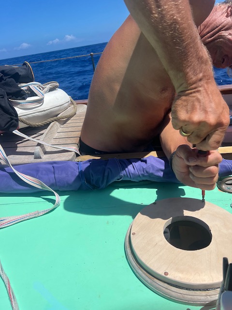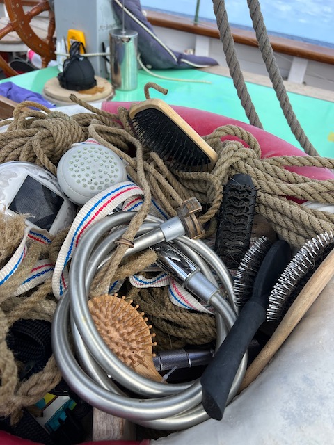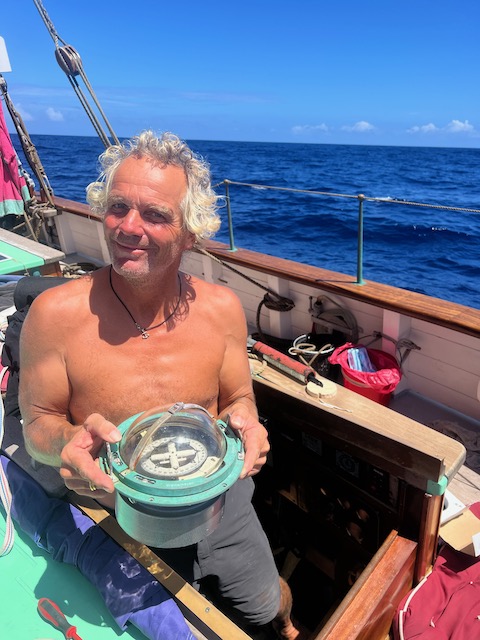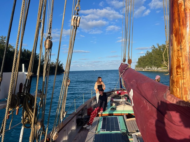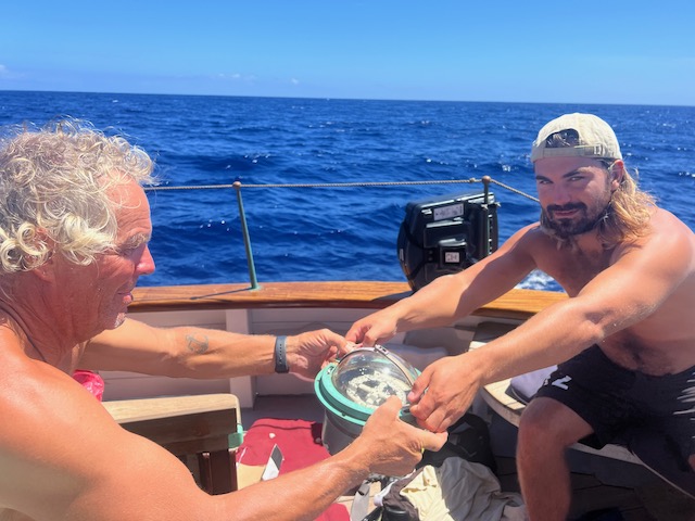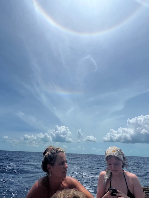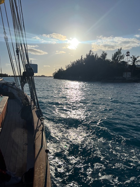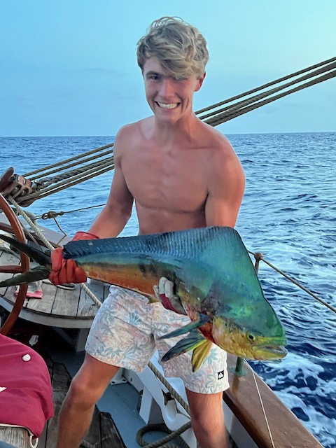 Wir sollen mindestens 5 Tage Südsüdostwinde bekommen, also herrliche Raumschots- bis Halbwindsegelei. Essen ist genug an Bord, Trinkwasser bereitet die Seewasserentsalzungsanlage zur genüge. Die Stimmung ist gut und nachdem wir uns durch die Riffs vor Great Exuma geschlängelt haben, nehmen wir Kurs an Cat Island, der äußersten Bahamas Insel, vorbei, gen Bermuda. Sanfte raume Winde treiben uns voran, bald steigt „Big Mama“, unser Leichtwetter Ballonklüver, empor. Die Fahrt ist schnell und angenehm. In der Dämmerung beißt ein 1,11 Meter großer Mahi Mahi, eine Goldmakrele, an, frischer Fisch für 2 Mahlzeiten. In seinem Magen, von Jesper unter Supervision unserer Meeresbiologinnen untersucht, finden sich neben klassischen kleinen Fischen auch zwei Triggerfischchen, ein aufgeblasener Mini Kugelfisch und ein Seepferdchen.
