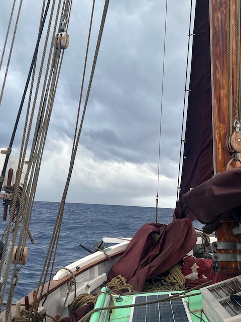 Zur Nacht wechseln wir auf den normalen Klüver, auch weil es mal wieder rundherum Blitzt und dräut. Bis auf ein paar wilde Winddreher und Schauerböen bleibt es aber friedlich, recht schnell zu friedlich. Der Wind schläft fast komplett ein, so dümpeln wir mit 1,5 bis 3 Knoten durch die Nacht. Morgens geht dann nichts mehr und der Motor an, so war es eigentlich nicht geplant. Diverse Segelversuche, Segelwechsel und Nervenbelastungen später, kommt Nachmittags der Wind zurück, wir gut voran. Für 2 Stunden, dann blitzt und donnert es überall, Böen von 32 Knoten wechseln